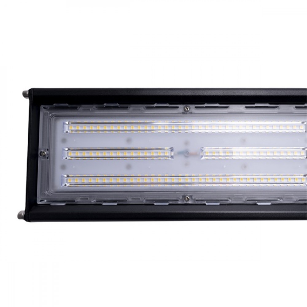 HB100W lineáris csarnokvilágító, 100W, 13000 lumen, 130lm/W fényhasznosítással, semleges fehér színhőmérséklettel - 4000K, átlagosan 50 000 üzemóra működéssel, 5 év garanciával, IP65-ös védettséggel.