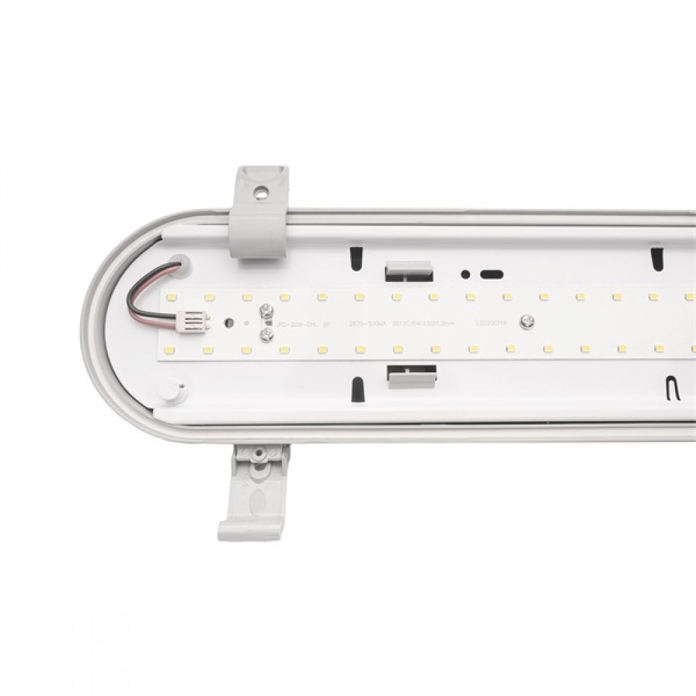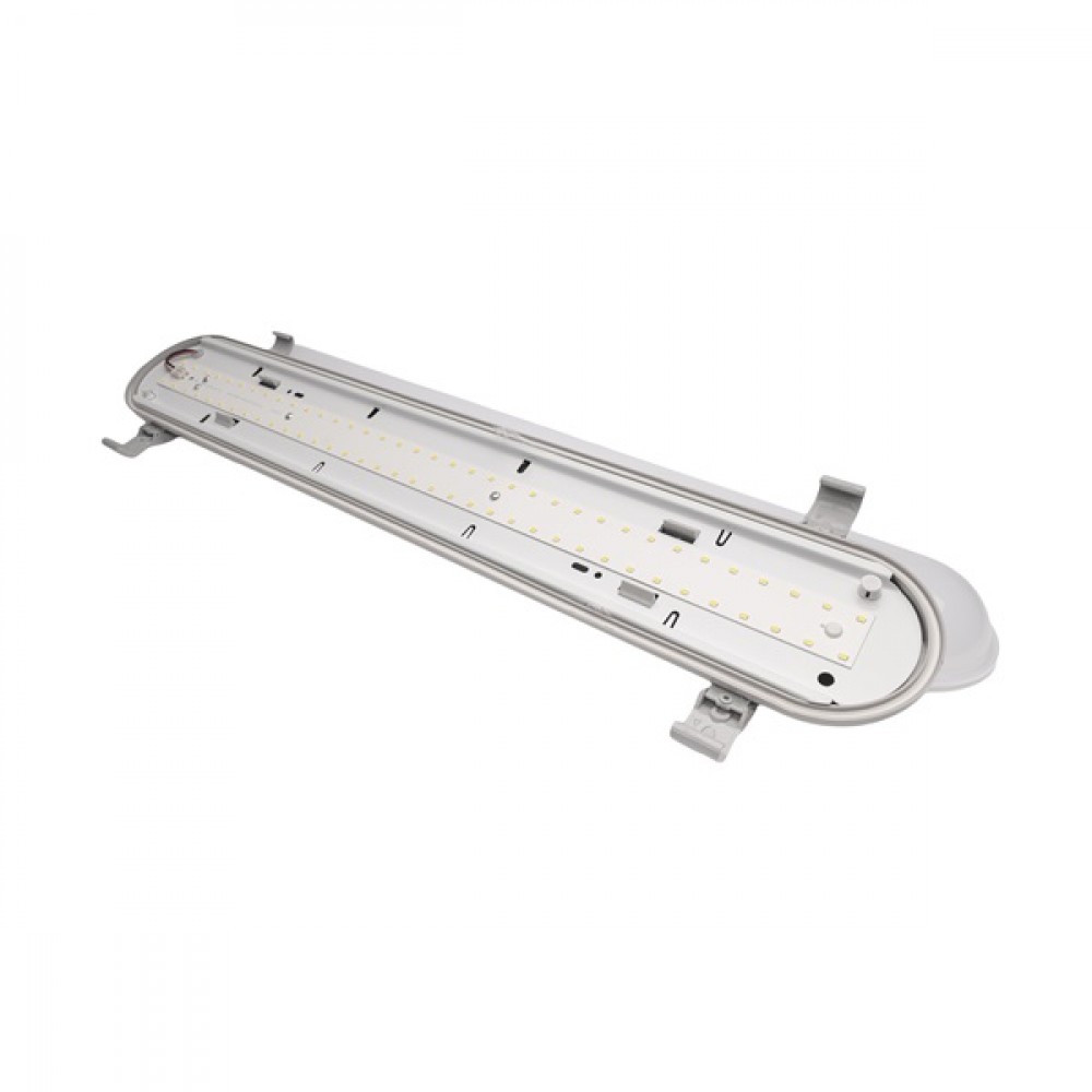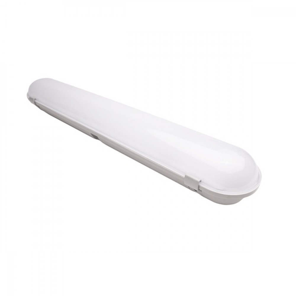 60 cm integrált LED-es por-és páramentes lámpatest, IP65 védettségű, vibrálás mentes driverrel, 20W, 2000 lumen, semleges fehér színhőmérséklettel - 4000K. A ház RAL7035 világosszürke polikarbonát, a búra UV-stabilizált opál színű polikarbonát.