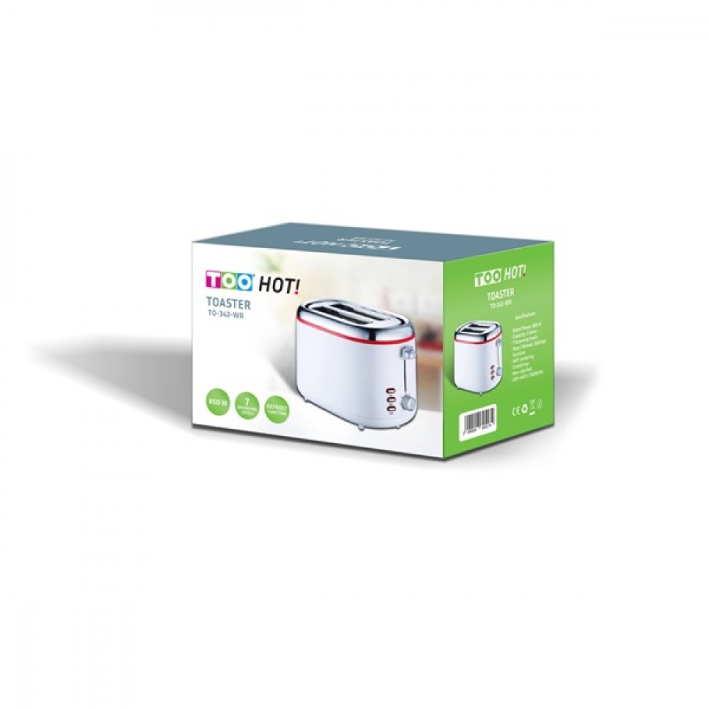 A TOO Hot! TO-343-WR 7 pirítási funkcióval rendelkező, kenyérpirítóval saját ízlése szerint tudja elkészíteni pirítósait. A 2 szeletes kenyérpirító kompakt méretének köszönhetően a konyha bármely részén elfér. Megszakító gombjával a pirítást bármikor megállíthatja, ellenőrizheti megfelel-e az Ön ízlésének, kiveheti, vagy folytathatja a sütést. Kivehető morzsatálcával rendelkezik, igy könnyű tisztán tartani a kenyérpirítót. A reggeli rohanásban elfelejtett pirítóst újra melegítő funkciójával másodpercek alatt felmelegíti.